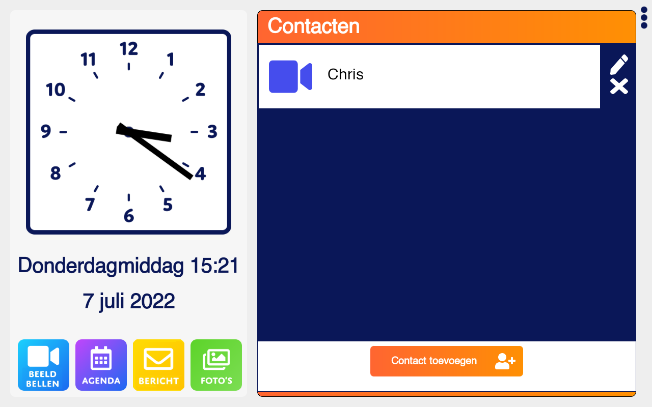 Als geregistreerde contactpersonen zijn toegevoegd is de Dagwijzer klaar voor beeldbelgebruik, de Dagwijzer gebruiker kan nu beeldbellen door op de knop met de naam van het contact te drukken. De wijzig en verwijder knop kunnen eventueel verborgen worden doormiddel van de “verberg bedienings knoppen” instelling in de beeldbel instellingen.