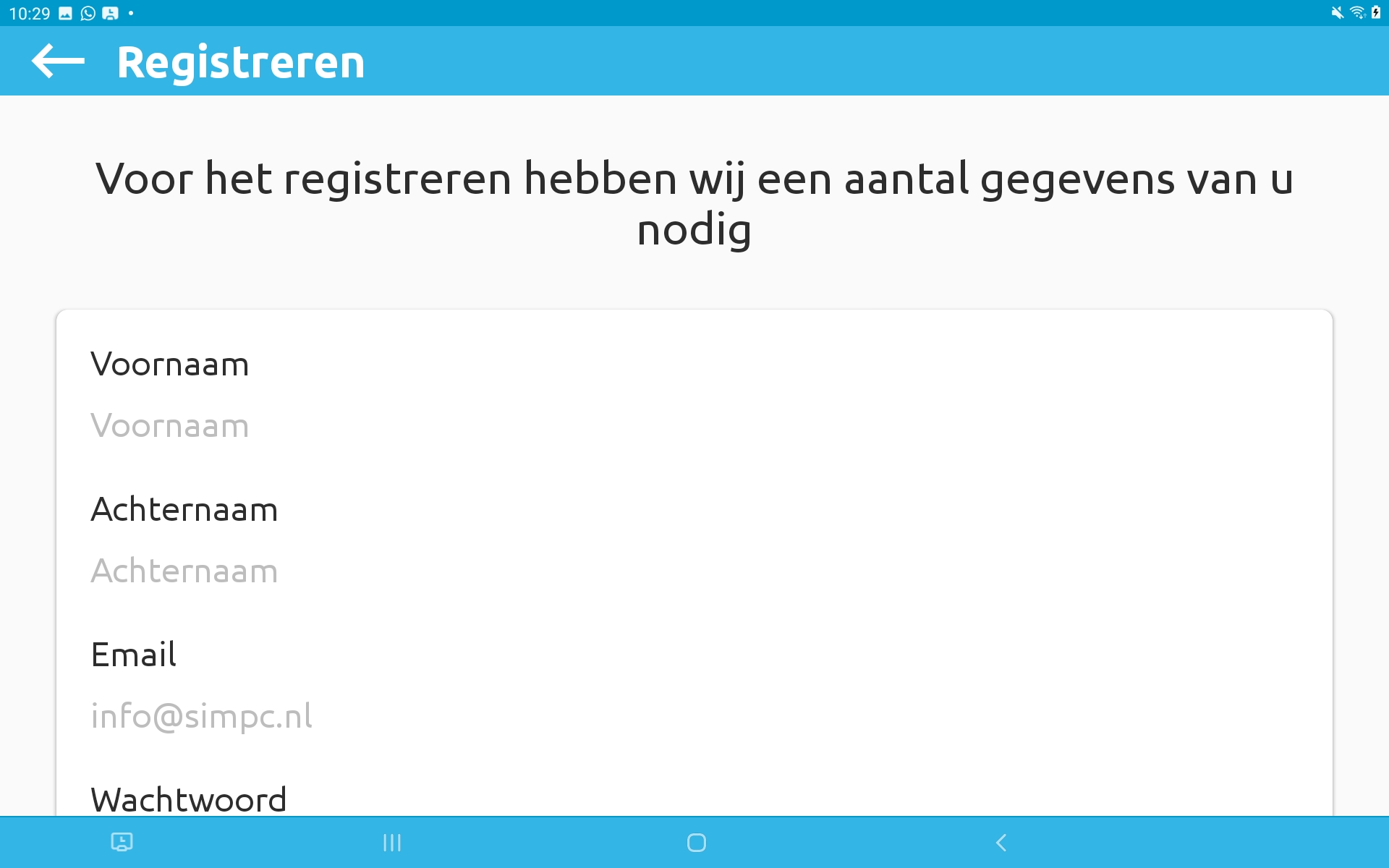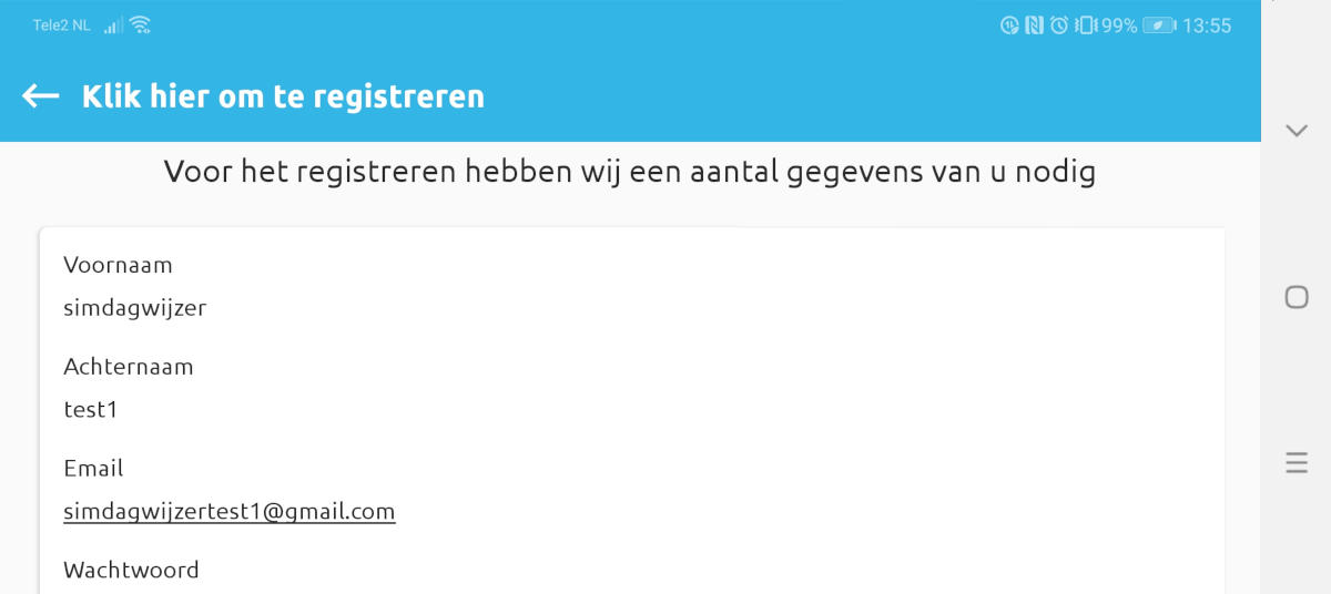 Alleen bij SIM geregistreerde gebruikers kunnen beeldbellen met de Dagwijzer. Daarom dien je jezelf eerst te registreren in de beeldbel app. Druk hiervoor op de knop ‘registreren’, vul het formulier in en druk vervolgens op de registreer knop. Het emailadres die je hier registreert heeft de Dagwijzer nodig om je als een contact toe te voegen.