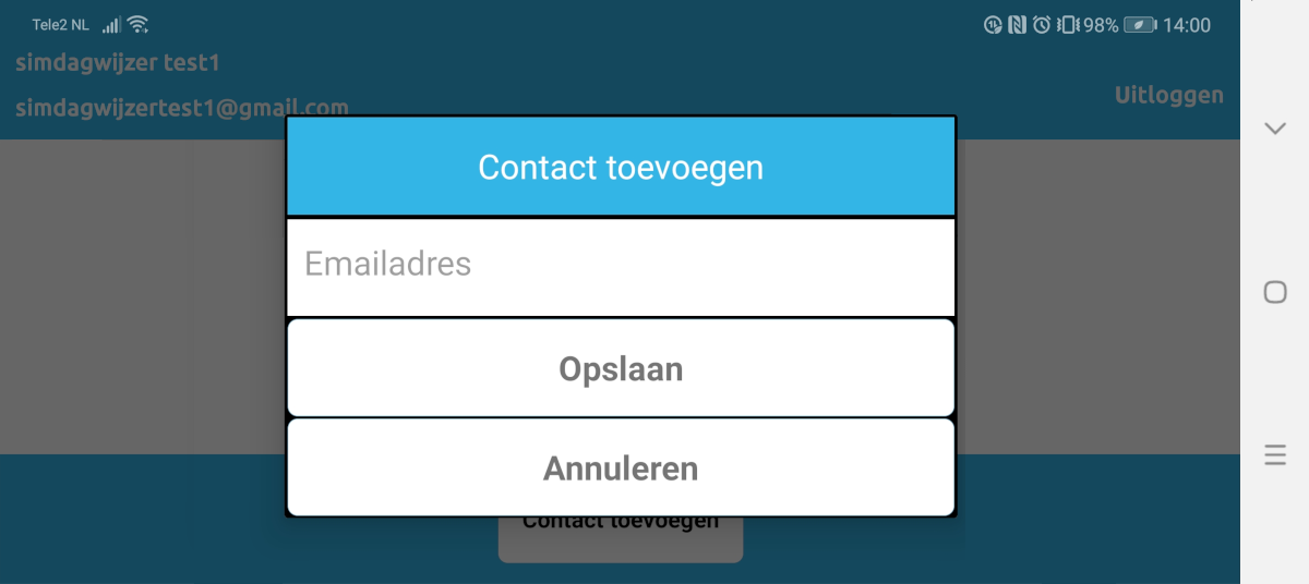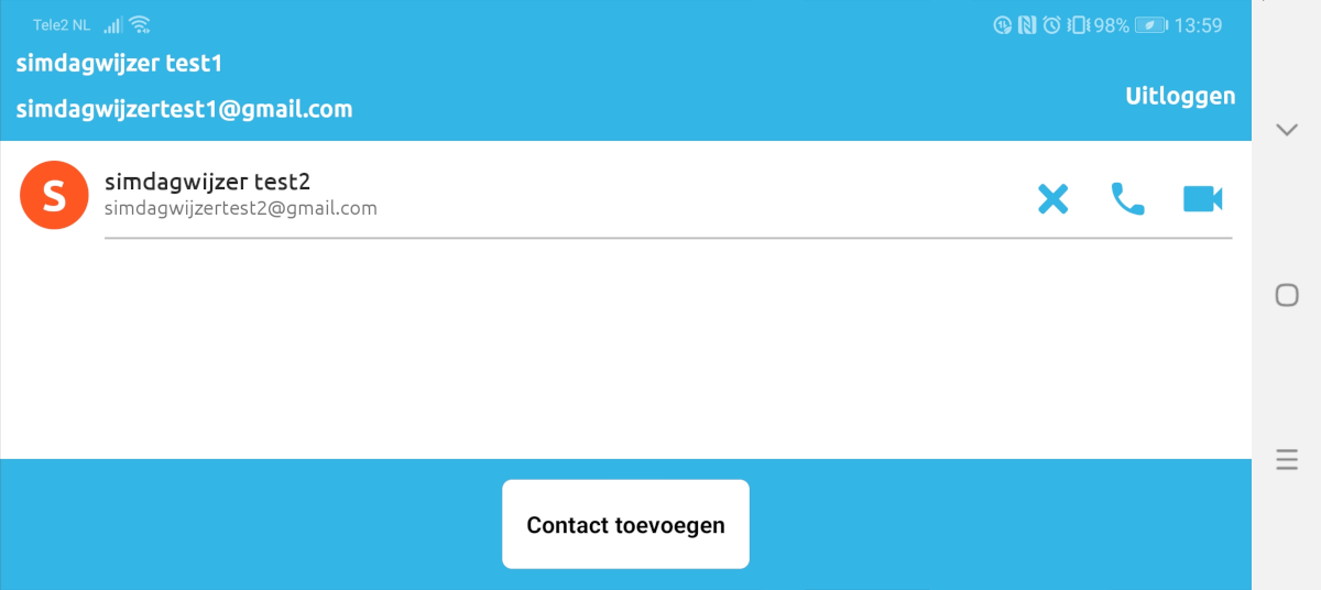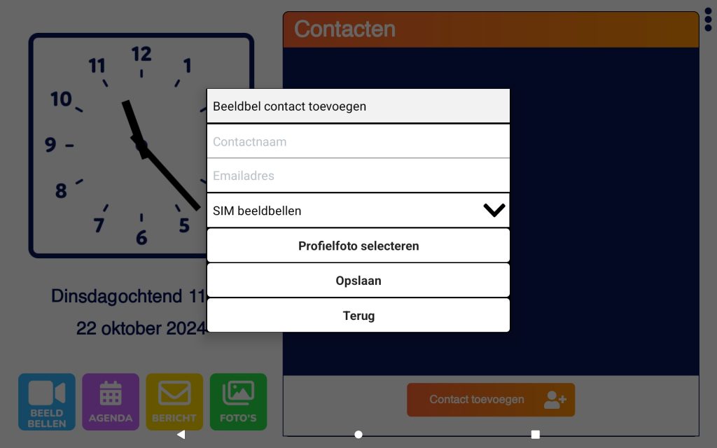 Koppel de Dagwijzer gebruiker aan de SIM beeldbel app door op ‘contact toevoegen’ te drukken. Vul hier het emailadres in dat gebruikt wordt voor het beeldbellen op de Dagwijzer. Druk vervolgens op opslaan, de SIM beeldbel app is nu klaar voor gebruik.