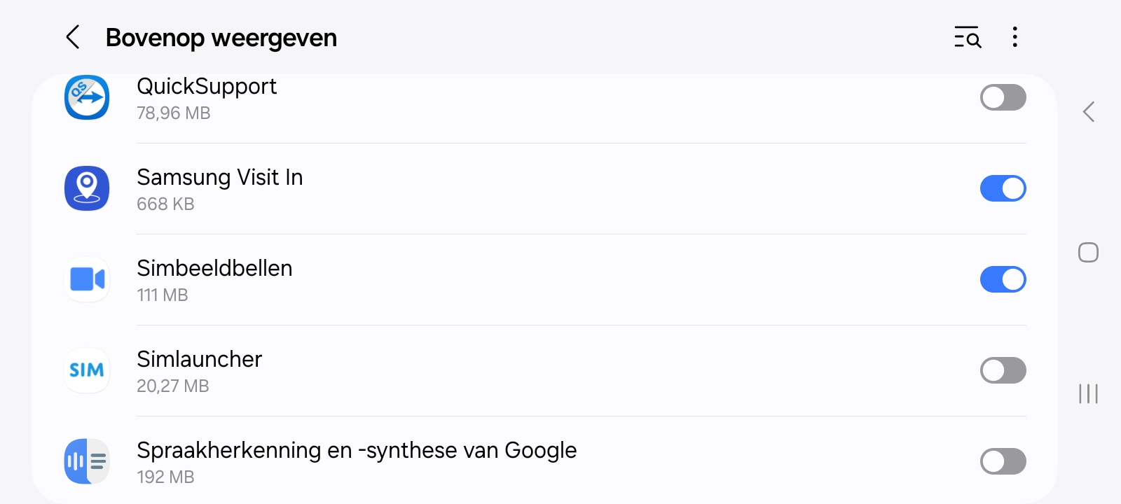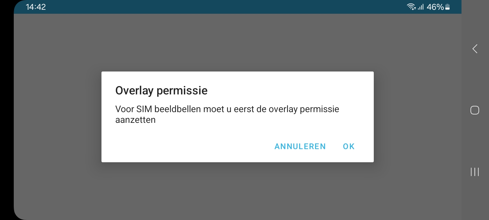 Zorg ervoor de overlay permissie is toegevoegd en alle permissies zijn geaccepteerd. Als je de melding ziet “Overlay permissie” klik dan op “oke” en klik vervolgens in de lijst op SIM beeldbellen om deze permissie aan te zetten. Hierna komen er nog een aantal permissie meldingen waarbij je op “toestaan” moet drukken.