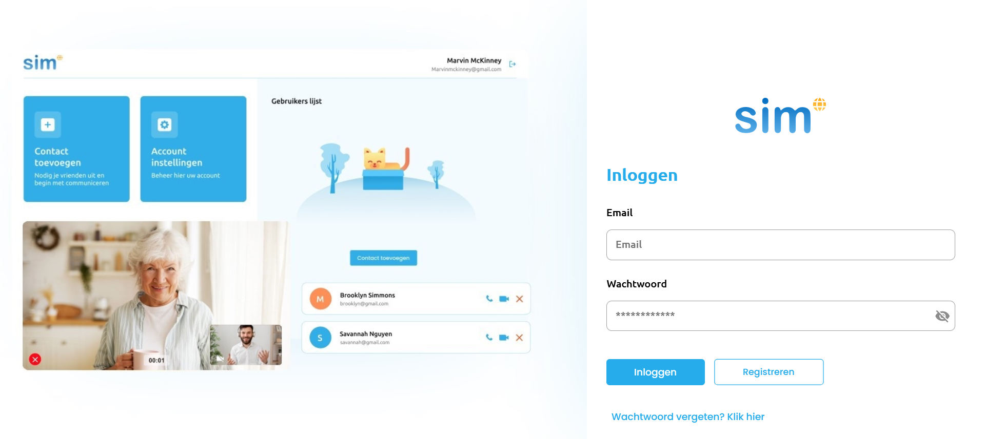 Let op dat u de Chrome browser heeft geïnstalleerd als u wilt beeldbellen via uw Windows pc/laptop. Op uw Mac/Macbook kunt u gewoon de Safari browser gebruiker. Ga vervolgens in Chrome of Safari naar de volgende website: beeldbellen.simpc.com. U krijgt nu het inlogscherm van SIM beeldbellen voor het web te zien. Druk op de knop “registreren” om een account aan te maken. Log daarna in met uw account.