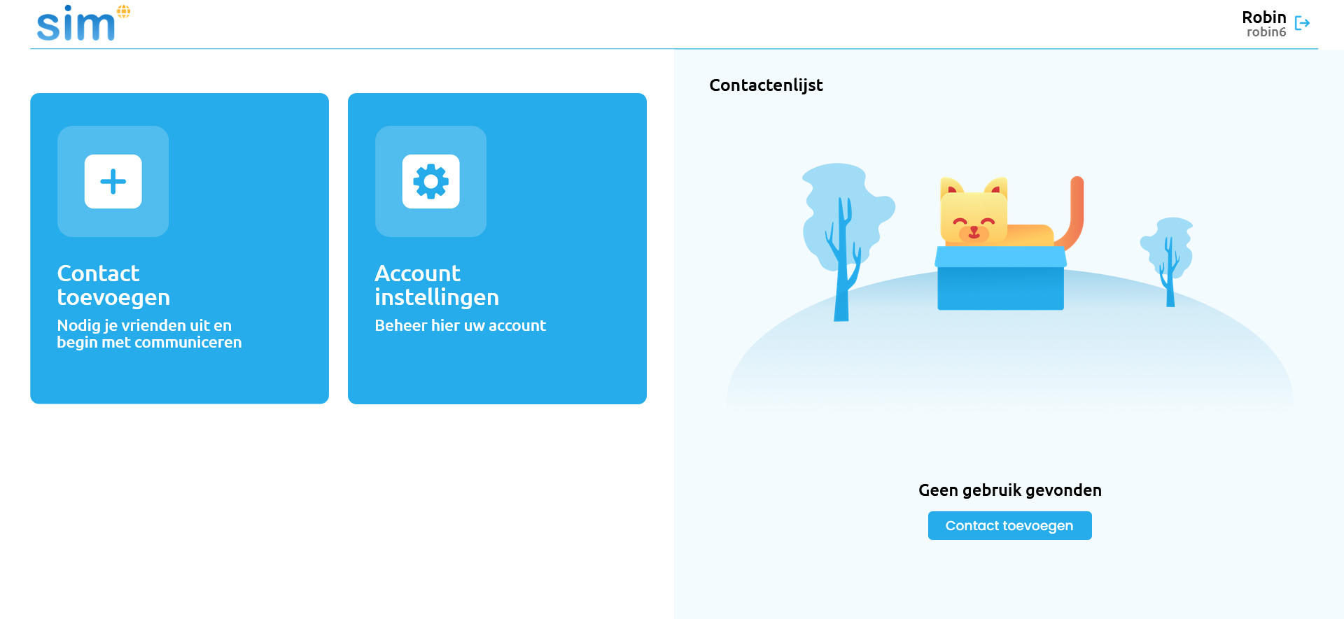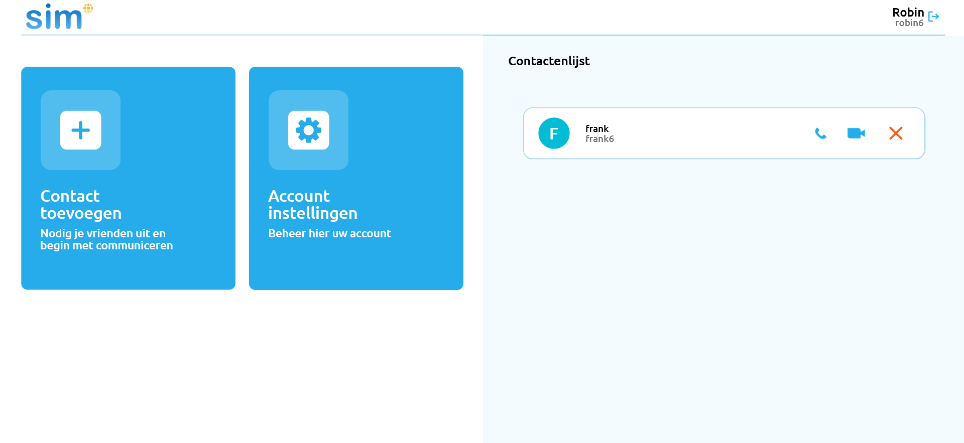 Na het inloggen zie je het scherm hiernaast. Hier kun je contacten toevoegen aan de contactenlijst. Klik op de knop “contact toevoegen” om de Dagwijzer gebruiker toe te voegen, druk vervolgens op opslaan, de SIM beeldbel app is nu klaar voor gebruik.