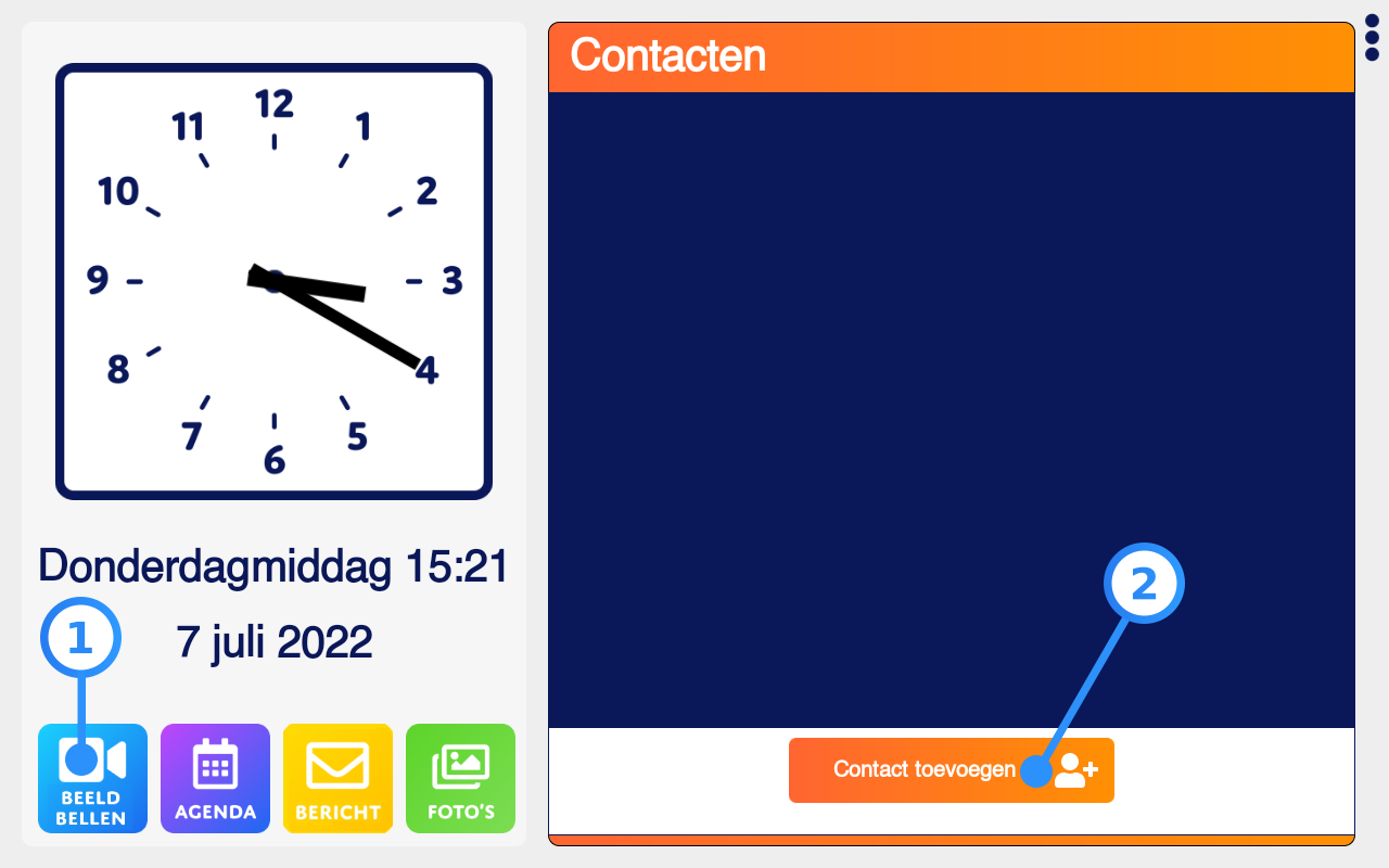 Met de Dagwijzer kun je beeldbellen met bij de SIM Beeldbelapp geregistreerde contactpersonen (zie sectie 4). Deze contactpersonen kun je toevoegen aan de contactenlijst door eerst op de ‘beeldbellen’ knop (1) en dan op de ‘contact toevoegen’ knop (2) die onder de contactenlijst staat.
